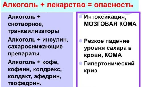 Навіть при незначному вживанні алкогольсодержащих напоїв, пацієнт може зіткнутися з посиленими побічними ефектами. Спостерігається погіршення психомоторики, рясна блювота, бронхоспазми і навіть втрата свідомості.
